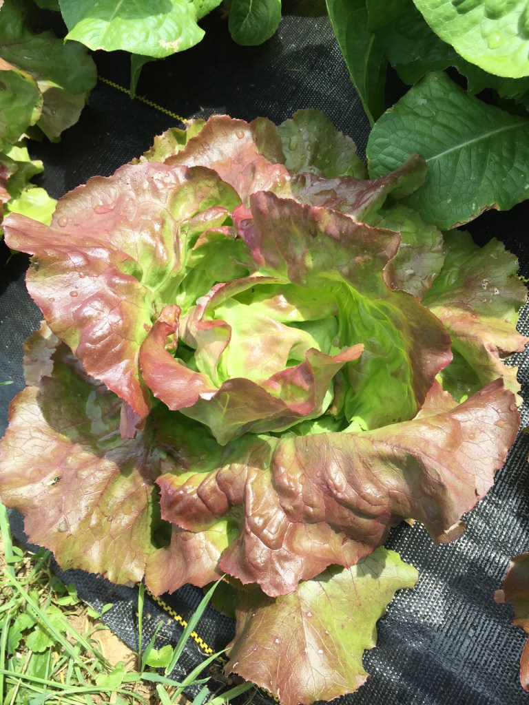 We’re light on the greens this week with no kale, chard or collards. The previous high heat spell made them question whether or not they really wanted to be here! I’m letting them rest and regroup this week encouraging them to regrow for us. I’ve seeded more of each in case they don’t cooperate. We will though, have some young lettuces, baby bok choy and escarole. And……….the tomatoes are here — slicers and cherries. Time for fresh salsa and tomato/basil salads, yum!